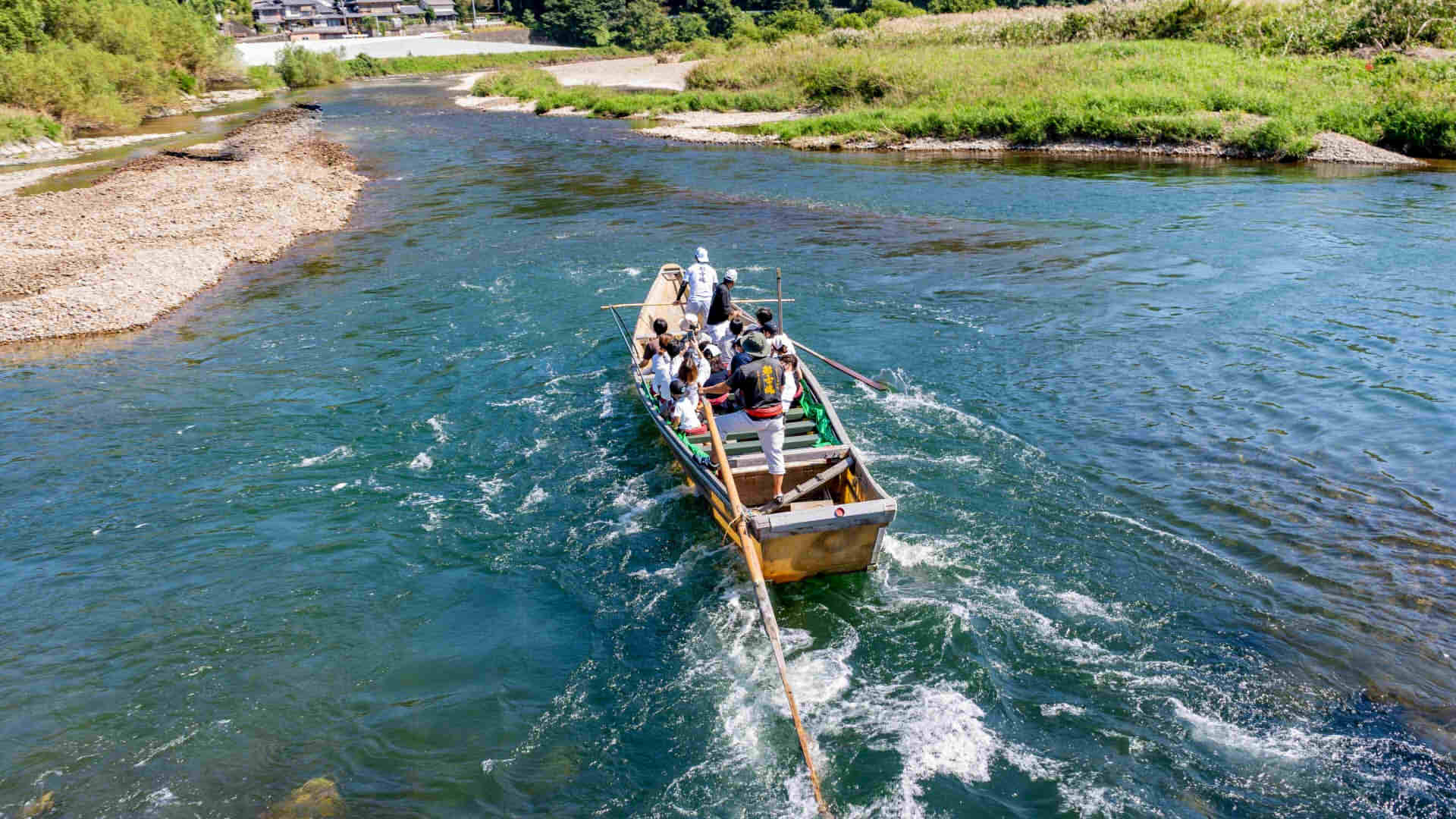 The Hozugawa Cruise (保津川下り) is a popular tourist attraction in Kyoto, Japan that takes visitors on a scenic boat ride down the Hozu River, which runs through the picturesque Arashiyama district. The ride starts from the Kameoka boarding point, and the traditional wooden boats take visitors on a 16-kilometer (10-mile) journey down the river to the Togetsukyo Bridge in Arashiyama. The journey typically takes about 2 hours, but can vary depending on water levels and weather conditions.